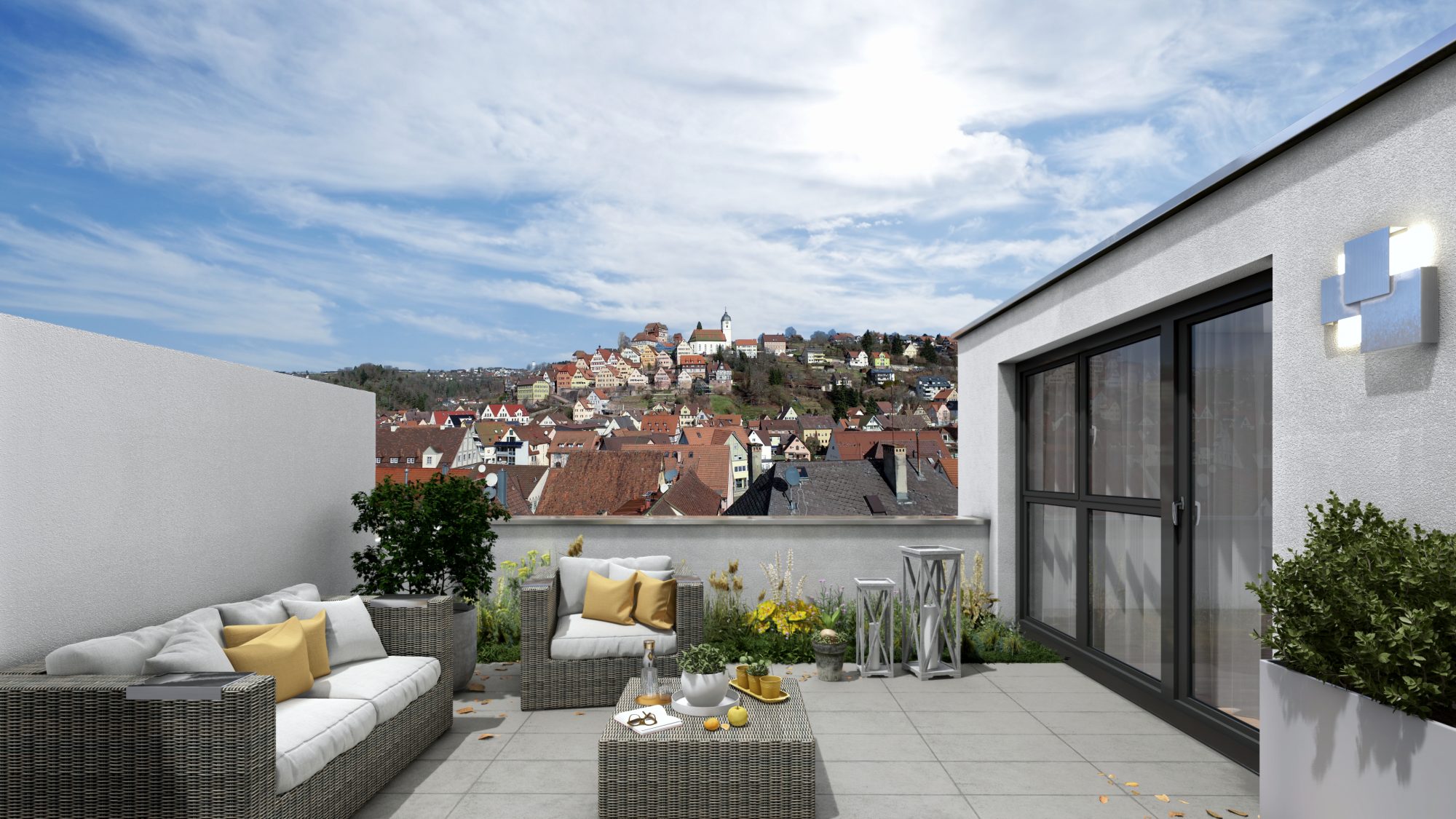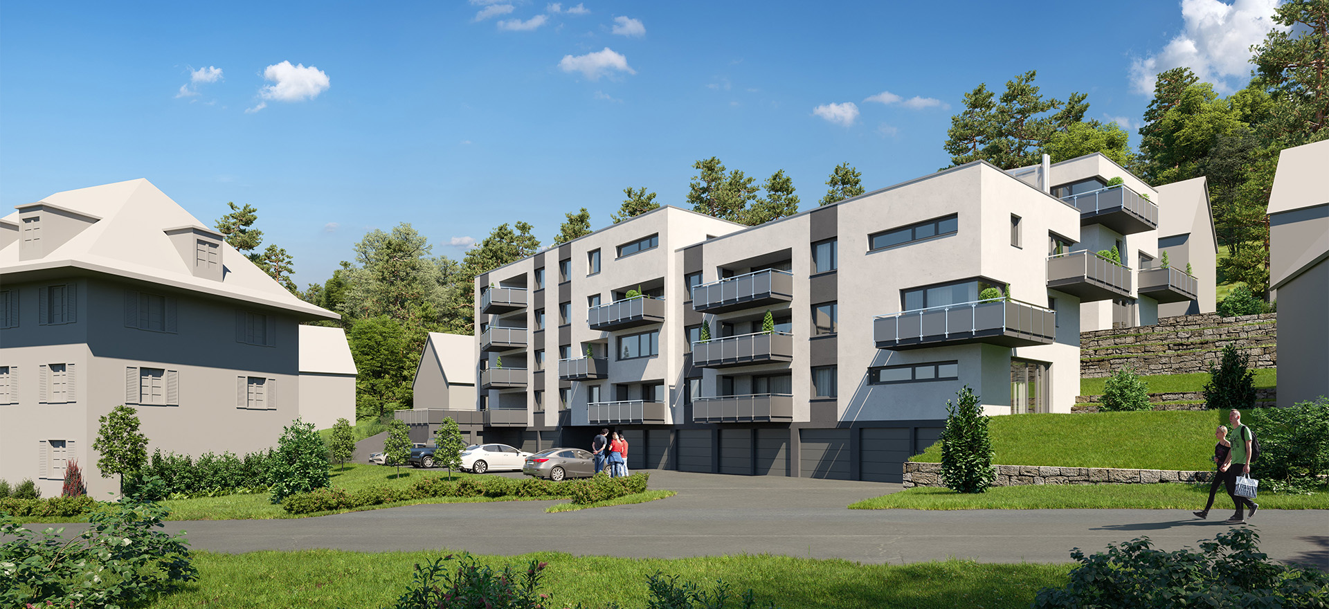 The modern residential quarter „Leben am Schlossberg“ in Altensteig is seamlessly integrated into the slope of Schlossberg and is located in close proximity to the Altensteig town center. The new building, constructed using solid materials and equipped with an elevator, offers 29 barrier-free residential units with two, three, or four rooms. On the first floor, four fully accessible units have been built. The units range from 40 to 100 square meters in size and each includes a balcony, terrace, or private seating area, a kitchen, and a Smart-Home system. The building is heated via gas-powered underfloor heating.